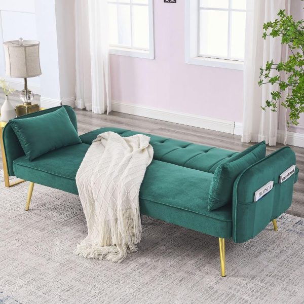 72.5" Convertible Sofa Bed, Adjustable Velvet Sofa Bed – Velvet Folding Lounge Recliner – Reversible Daybed – Ideal for Bedroom with Two Pillows and Center Leg (Green)